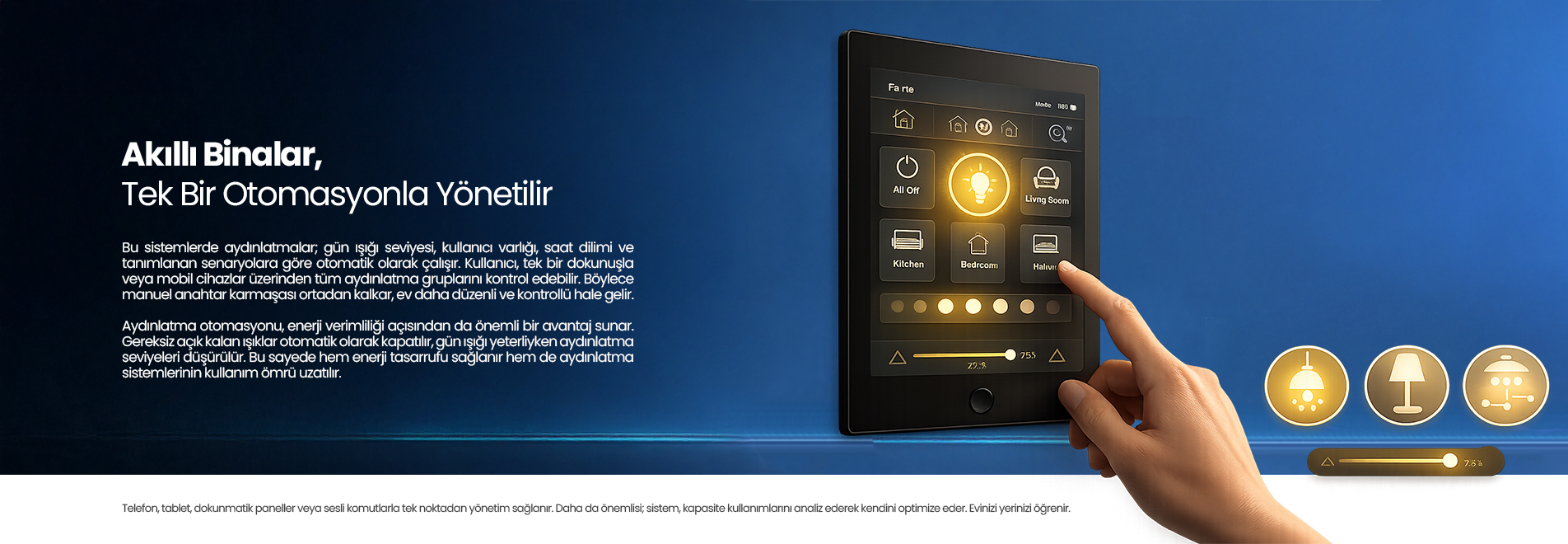 Aydınlatma otomasyonu, enerji verimliliği açısından önemli bir avantaj sunuyor. Gereksiz açık kalan ışıklar otomatik olarak kapatılır, gün ışığı yeterliyken aydınlatma seviyeleri düşürülür. Bu sayede hem enerji tasarrufu hem de aydınlatma verimi kullanım ömrü uzatılır. Yeni yapılarda altyapılarla, mevcut yapılarda ise kablosuz çözümlerle uygulanabilen aydınlatma otomasyonu; konfor, estetik ve tasarruf bir arada sunan akıllı ev sonuçlarının temel yapı taşlarından biridir.