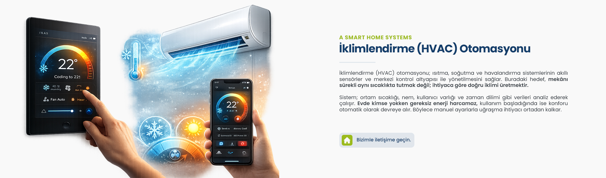 HVAC otomasyonu, enerji maliyetlerini ciddi biçimde değiştirir. Klima ve yerden ısıtma gibi yüksek tüketimli sistemler yalnızca çalışır, aşırı çalışma ve dengesiz sıcaklık sorunları önlenir. Doğru projelendirilmiş bir iklimlendirme otomasyonu, konfor artışıyla birlikte ölçülebilir tasarruf sağlar. Yeni yapılarda merkezi sistemlerle, mevcut yapılarda akıllı termostat ve kontrol modülleriyle uygulanabilen HVAC otomasyonu; Akıllı evin performansının en kritik ve en fazla faydanın ortaya çıkmasından biridir.