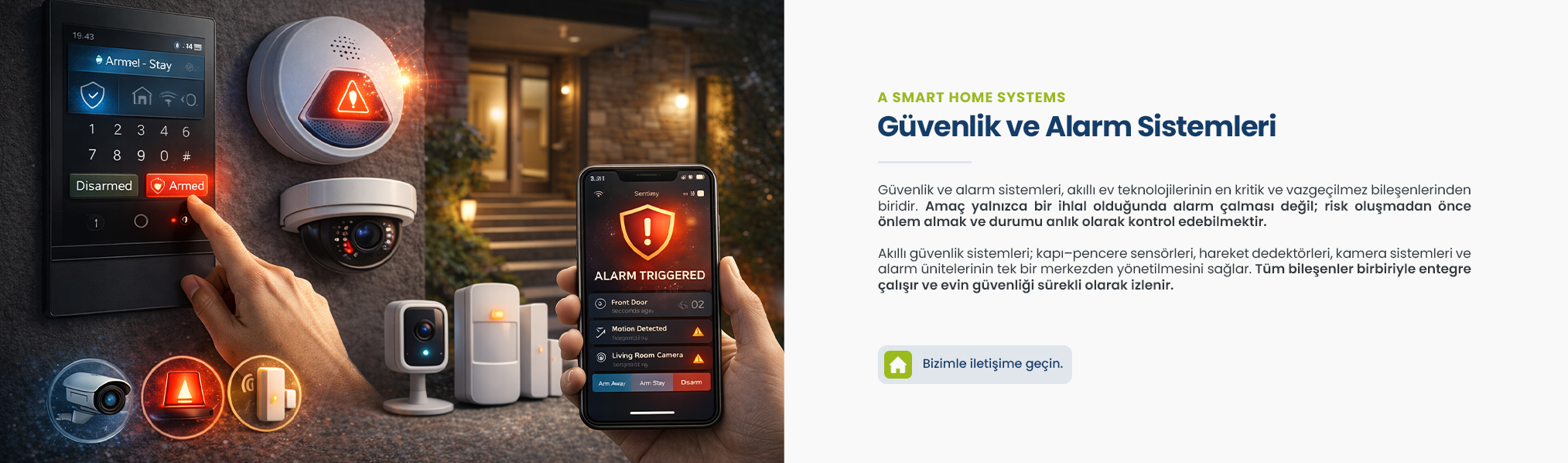 Güvenlik ve alarm sistemleri, akıllı ev teknolojilerinin en kritik ve tamamlayıcı parçalarından biridir. Amaç yalnızca bir kesinti olduğunda alarm çalması değil; Riskin giderilmesinden önce önlem almak ve anlık olarak kontrol edilmesidir. Akıllı güvenlik sistemleri; kapı–pencere sensörleri, hareket dedektörleri, kamera sistemleri ve alarm ünitelerinin tek bir merkezden bölmesini sağlar. Tüm paketler ücretsiz entegre çalışır ve evin güvenliği sürekli olarak izlenir.