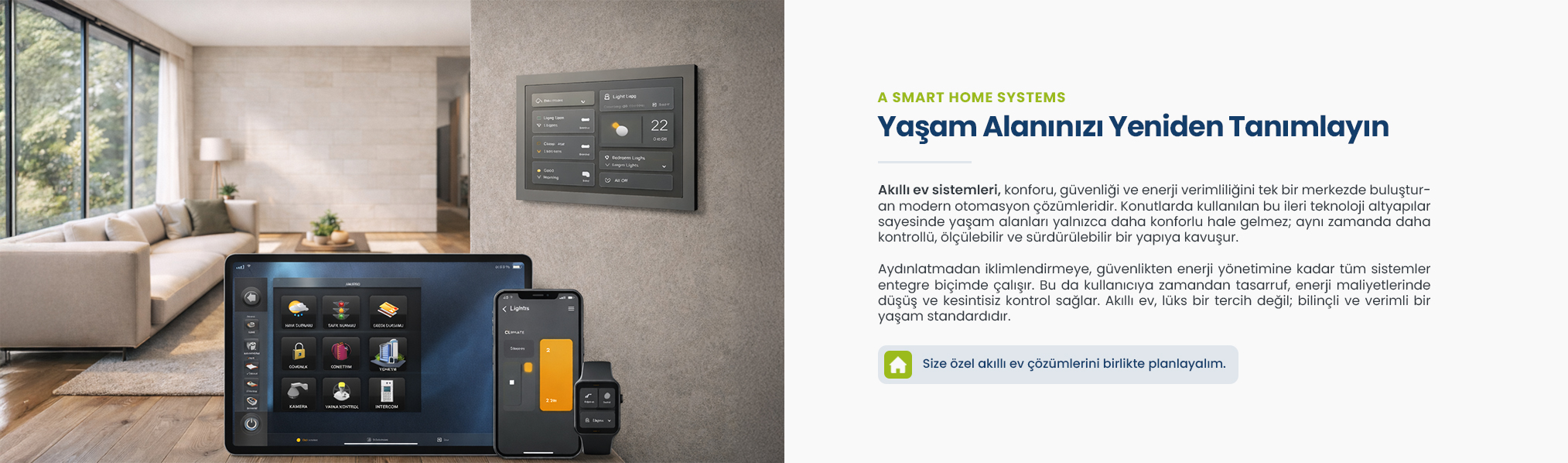 Akıllı ev sistemleri, yaşam alanlarını modern teknolojilerle dönüştüren; konfor, güvenlik ve enerji yönetimini tek bir merkezde birleştiren ileri seviye otomasyon çözümleridir. Konutlarda kullanılan bu akıllı altyapılar sayesinde mekânlar yalnızca daha konforlu hale gelmez, aynı zamanda daha kontrollü, verimli ve sürdürülebilir bir yapıya kavuşur.