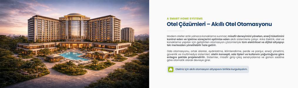 Arkıs Elektrik, Avrupa ve dünya genelinde çoklu bina otomasyonunda referans olarak kabul edilen EIB/KNX satış ile otel odaları ve ortak alanlarda; aydınlatma, iklimlendirme (HVAC), perde-panjur, enerji yönetimi ve multimedya sistemlerini entegre şekilde yönetilebilir hale getirir. Bu sistemleri; oda içi kontrol panelleri, konaklama merkezi, mobil cihazlar ve web tabanlı bölümler üzerinden güvenli biçimde kontrol edilebilir.